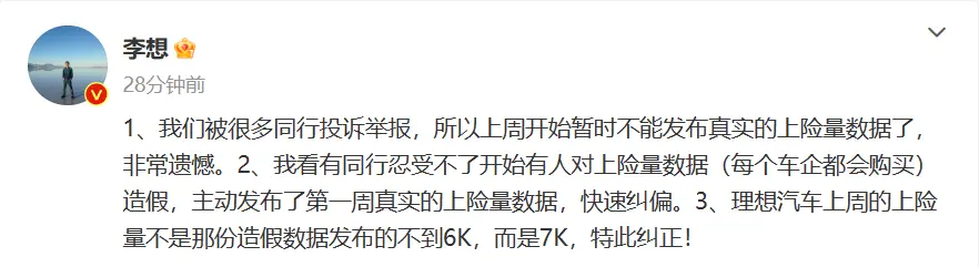 5 月 15 日音讯,抱负轿车 CEO 李想今天在微博发文,表明被许多同行投诉告发,所以上星期开端暂时不能发布实在的上险量数据了。“抱负轿车上星期的上险量不是造假数据发布的不到 6K,而是 7K。”